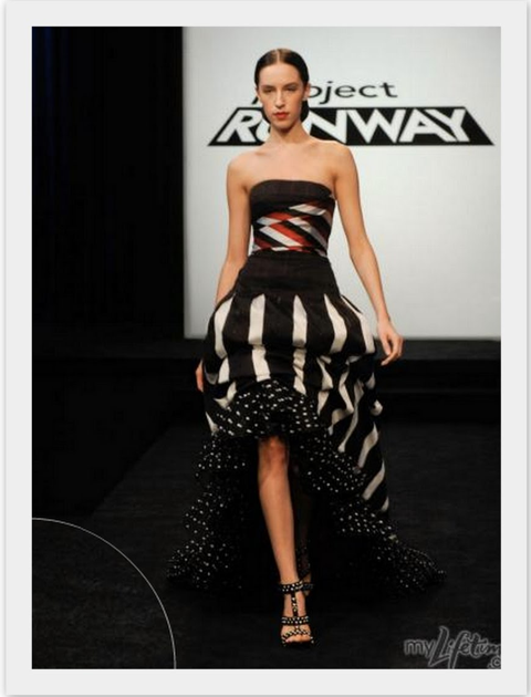 Project Runway this season hasn't had much "run" in it. In fact, the entire season has been stuck in neutral - neutral colors, neutral designs, neutral characters. Where are the epic screaming matches and hair pulling? The accusations of plagiarism? The whisperings about cheating? Every episode has felt like the TV audience was taken on a trip to Baskin' Robbins with its dozens of ice cream choices - and forced to order vanilla. So it was really a surprise in the final challenge to see this dress below. It is, in a word, FANTASTIC. Michael Kors said it was the best piece of the season, and he's (of course. duh.) right. And it guaranteed designer Emilio a slot at the coveted Bryant Park show. Sadly, the pics don't do it justice. If you get a chance, catch the full episode (and gown close-up)
